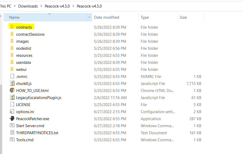 Faça o Download dos arquivos .json de contratos do canal share-contracts no Discord do Peacock. Coloque o arquivo .json na sua pasta Contracts, como mostrado aqui: