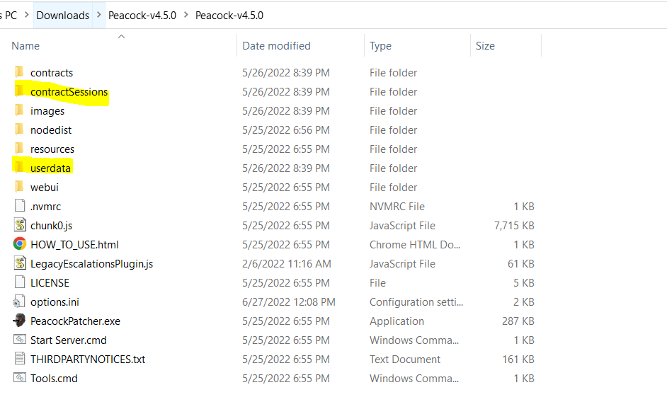 • Copie suas antigas pastas userdata and contractSessions da pasta de instalação anterior do Peacock, e cole na sua nova pasta de instalação do Peacock. Substitua qualquer arquivo existente na pasta da nova versão do Peacock, se necessário.